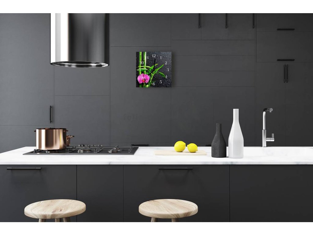 Nástěnné hodiny obrazové na skle - Bambus a orchidej