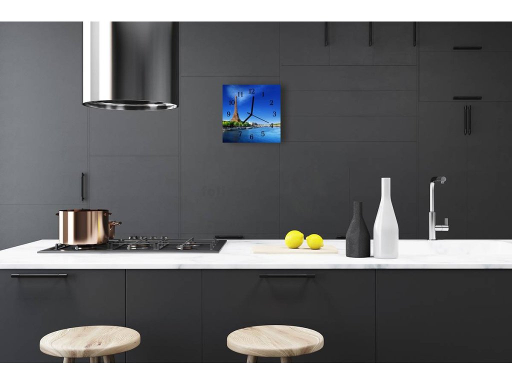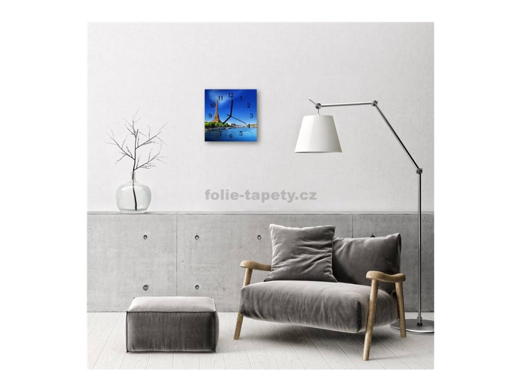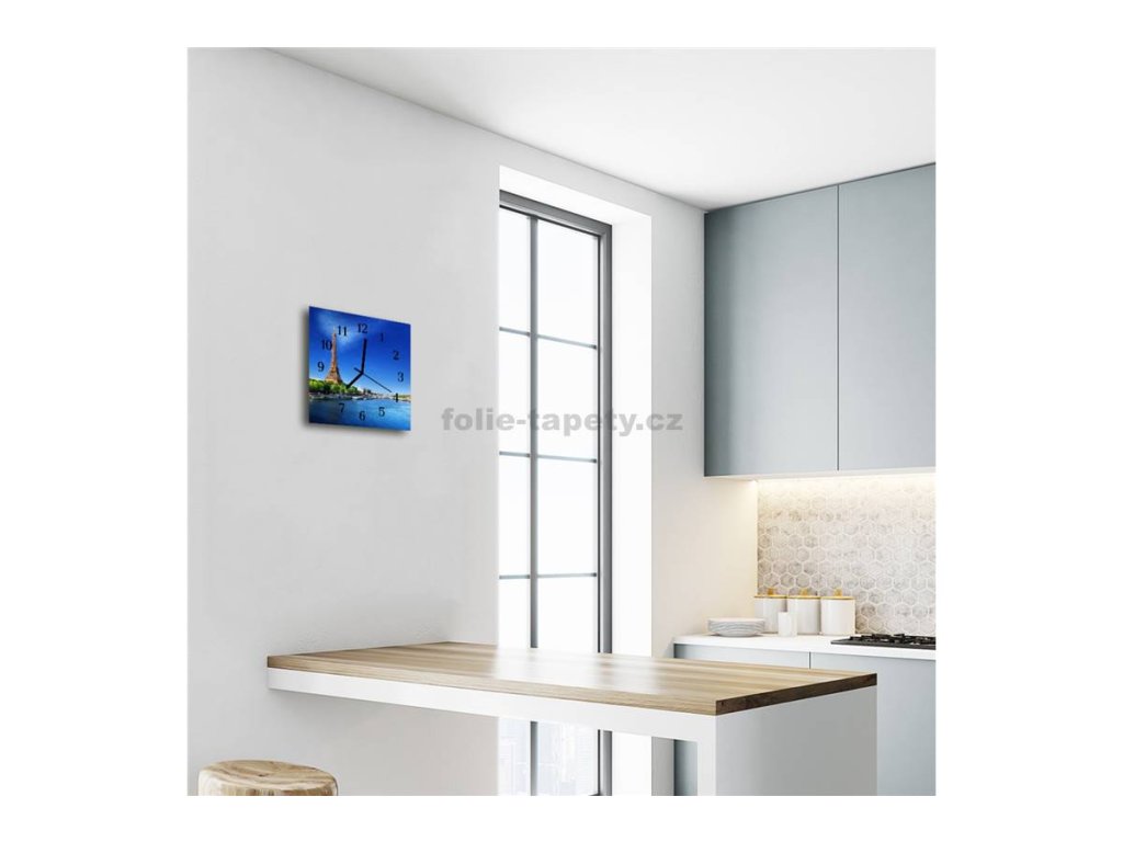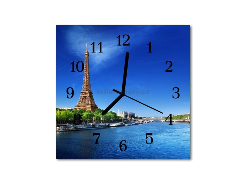 Nástěnné hodiny obrazové na skle - Eiffelova věž ve dne