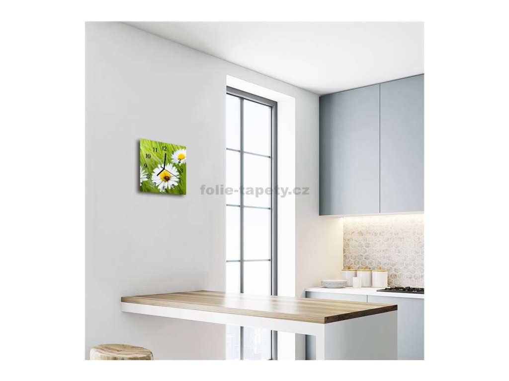 Nástěnné hodiny obrazové na skle - Kopretiny a beruška