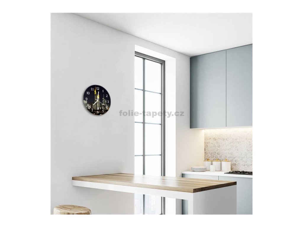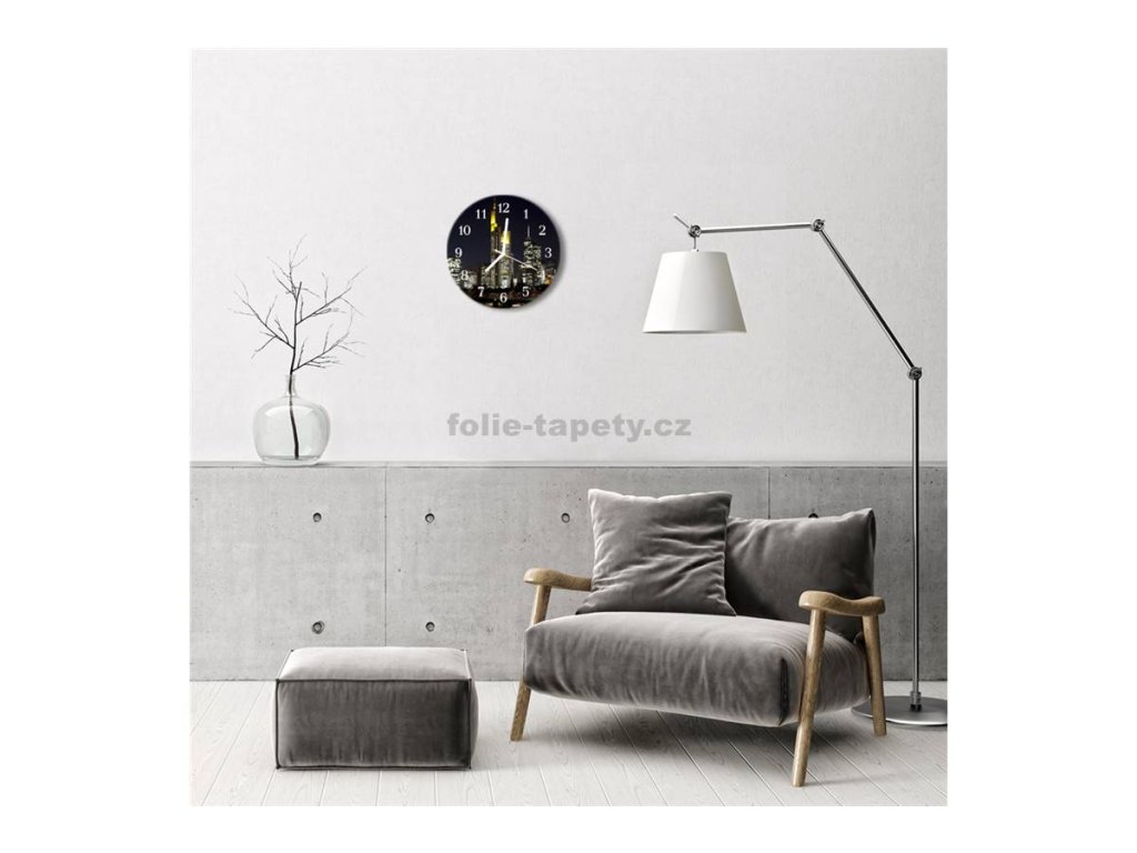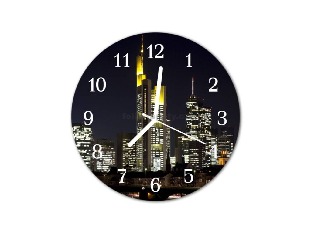 Nástěnné hodiny obrazové na skle - Mrakodrap ve tmě