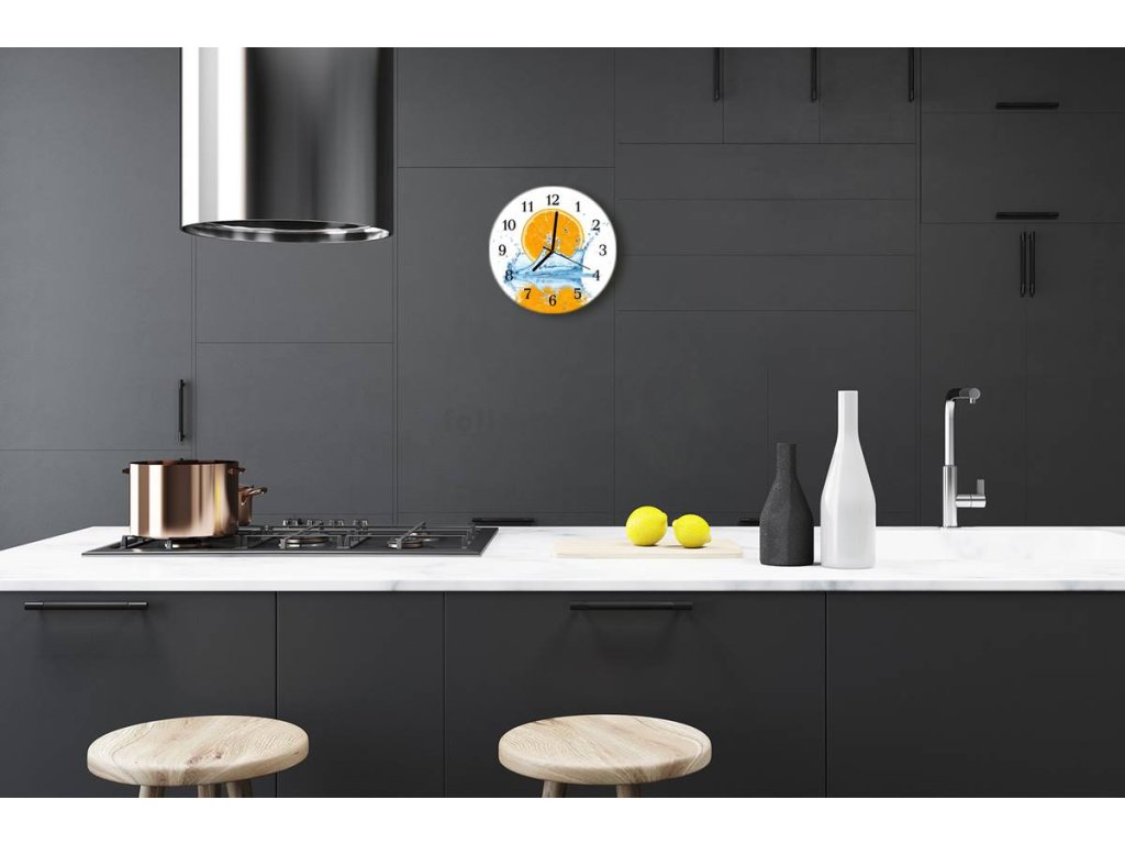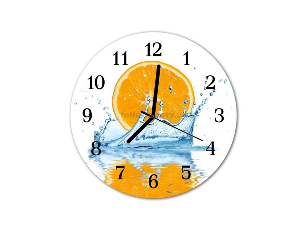 Nástěnné hodiny obrazové na skle - Pomeranč ve vodě