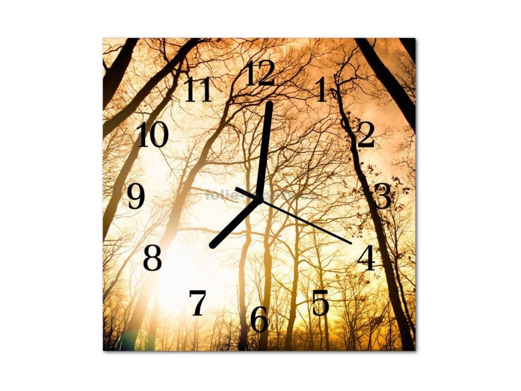 Nástěnné hodiny obrazové na skle - Západ slunce v lese